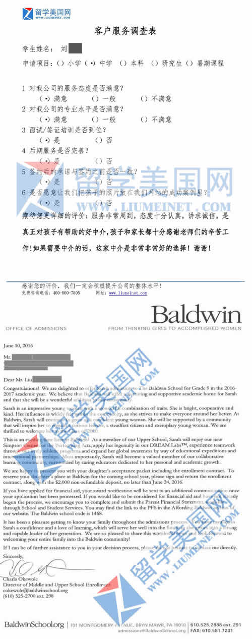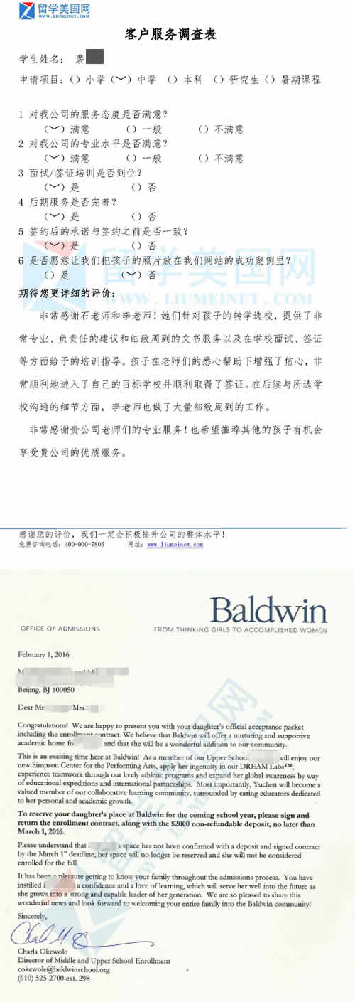 LYS同学的满意评价表和鲍德温女校录取offer展示 【学校考察详情】