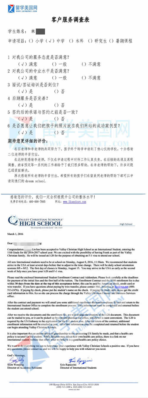 LYZ同学的满意评价表和山谷基督中学录取offer展示 【学校考察详情】