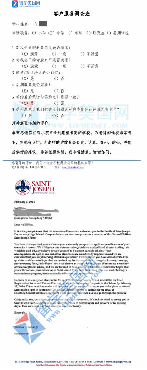 HZX同学的满意评价表和波士顿圣约瑟夫中学录取offer展示