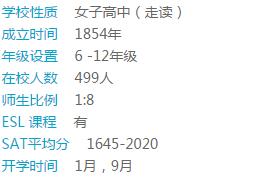 波士顿地区160年女校,校内AP课程9门(学生可以通过visual high school网上选修更多AP课程),荣誉课程28门,高级课程40门,地理极佳,200英亩校园面积,距离波士顿40分钟。学校是艺术与钢琴的殿堂,注重女性气质培养。