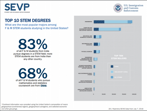 报告还指出持有F或M签证的在美国际学生中最流行的前十个专业。根据报告,83%的持有F或M签证的印度留学生中选择学习STEM学科,是来美学习STEM的主力国家;而持有F或M签证的中国留学生中,有68%的同学选择数学和统计课程。