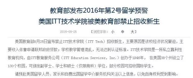 9月26日,教育部连发2016年第2号和第3号两通留学预警,针对美国ITT技术学院被美教育部禁止招收新生、美国旧金山湾区一所高中涉嫌欺诈我留学生的事件,向广大赴美留学生及家长发出警示。