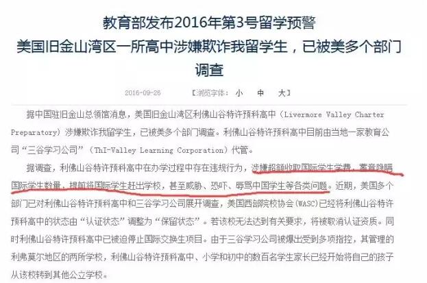 据中国驻旧金山总领馆消息,美国旧金山湾区利佛山谷特许预科高中(Livermore Valley Charter Preparatory)涉嫌欺诈我留学生,已被美多个部门调查。利佛山谷特许预科高中目前由当地一家教育公司“三谷学习公司”(ThI-Valley Learning Corporation)代管。