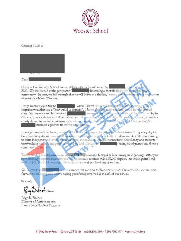 恭喜留美网YHC同学获得Wooster School伍斯特学校录取Offer