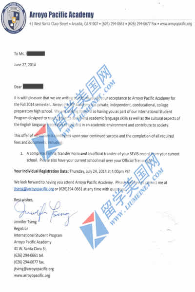 恭喜TXQ同学获得Arroyo Pacific Academy阿罗约太平洋学院offer录取