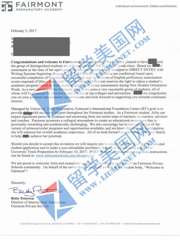 恭喜YAL同学获得费尔蒙特预科学院 Fairmont Preparatory Academy录取offer