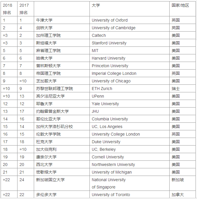 此次排名中最令人意外的是,英国的两所传统名校:牛津大学和剑桥大学分列排明前两位, 这也是THE大学排名发布以来首次由两所英国大学雄踞二甲。美国高校虽位列其后,加州理工、斯坦福、MIT等榜上常客并无明显变化。