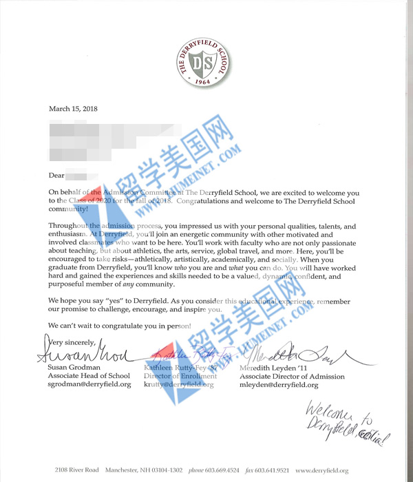 大家好!留美网又收到一个同学的录取offer!恭喜W同学获得 The Derryfield School 录取offer!W同学很优秀,在申请最后阶段以优异的成绩,完美的面试,赢得了招生官的喜爱!在这里祝W同学前程似锦!学业有成!美国高中申请可以马上咨询:400-000-7805,010-65183908,微信:liumeinet2014