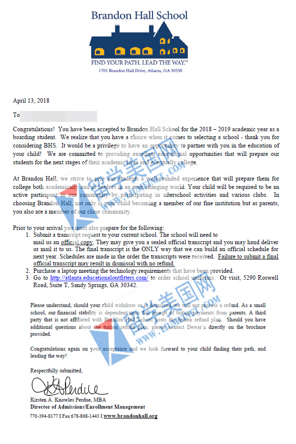 恭喜HXH同学成功补录到寄宿高中 Brandon Hall School