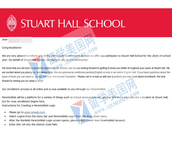 恭喜H同学成功补录到寄宿学校Stuart Hall School,美国高中补录正在进行中,咨询热线:400-000-7805,010-65183908,微信:liumeinet2014