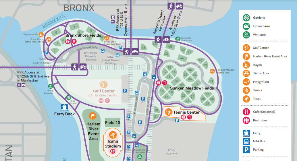 学校体育部同时利用学校和纽约市的设施。足球队和棒球队在兰德尔岛的球场上练习。田径队利用兰德尔岛和中央公园。除了学校的两个体育馆外,篮球队还利用篮球城和切尔西码头的体育馆设施进行训练和比赛。网球队在皇后区法拉盛的美国网球公开赛主场国家网球中心以及森林山的西区网球俱乐部练习和比赛。高尔夫团队练习在兰德尔岛和切尔西码头的练习场进行;比赛在莫斯科举行。