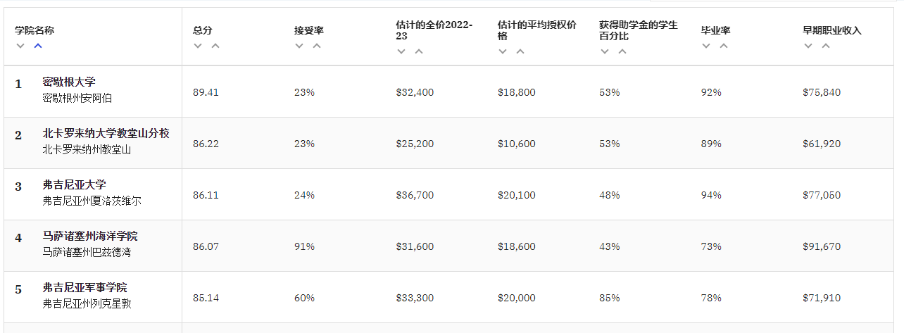 从评估的这些要素来看,可以看到这份排名考虑的方面还是蛮全面的,既关注学校的教育质量,也关注学生实际的投资花费、社会经济情况及毕业后的发展和收入。