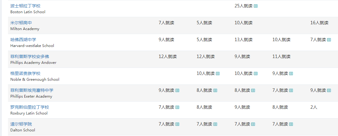从2017-2021年哈佛大学的美国高中来源数据中可以看出:波士顿拉丁学校、菲利普斯安多佛中学、格里诺贵族学校、菲利普斯埃克塞特中学、哈佛西湖学校、罗克斯伯里拉丁学校、道尔顿学院、哈克学校、布里尔利学校、霍奇基斯中学、格罗顿学校的录取人数都比较可观。