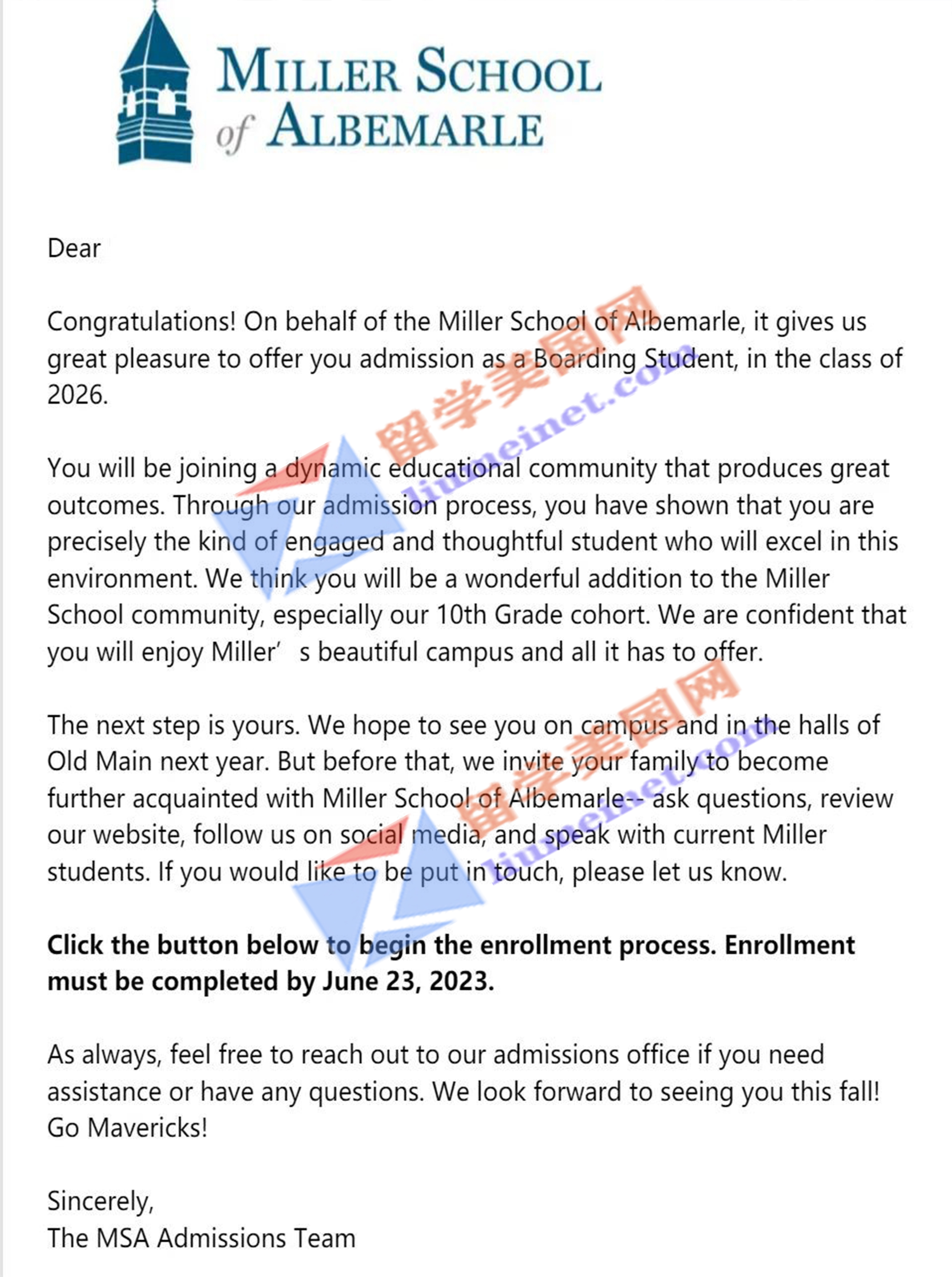 留美网喜报频传:恭喜留美网T同学斩获米勒中学Miller School of Albemarle的录取offer!