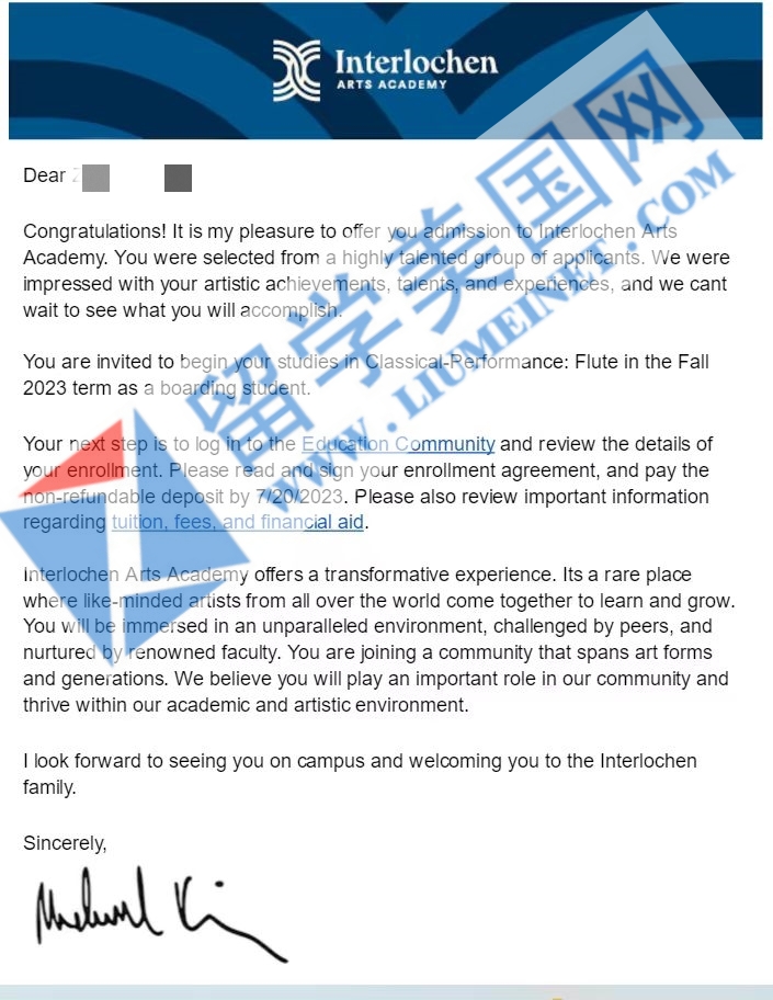 恭喜留美网学子X同学成功斩获因特劳肯艺术学院Interlochen Arts Academy