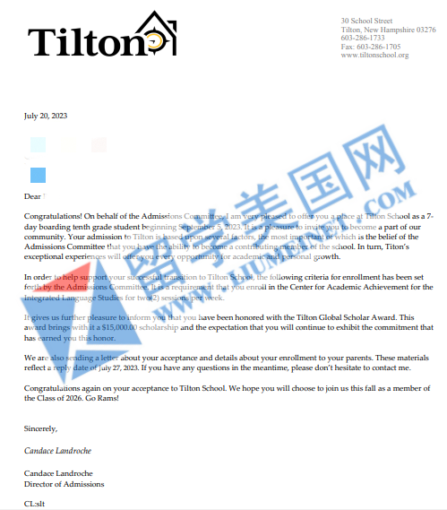 恭喜留美网学子M同学成功斩获提尔顿中学Tilton School学校录取offer!