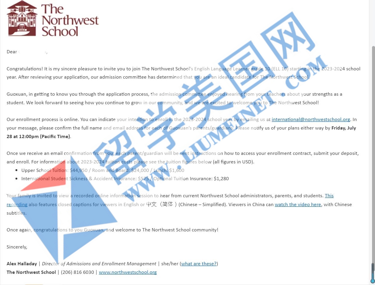 功夫不负有心人,M同学在沟通交流中越来越自信,我们能切实感受到学生身上所展现的自信和阳光在慢慢绽放,最终M同学成功斩获了西北中学The Northwest School的录取offer!