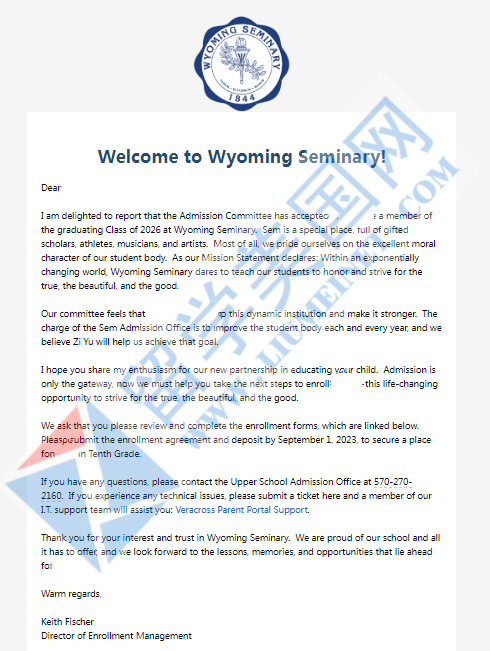 恭喜留美网学子Y同学成功斩获怀俄明高中Wyoming Seminary录取offer!