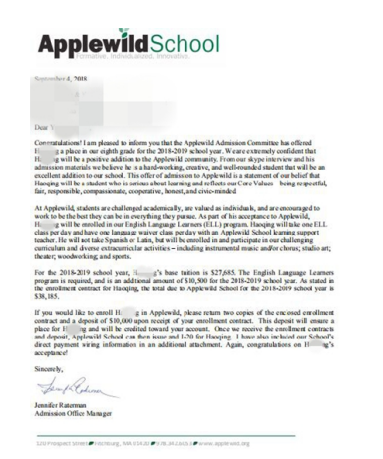 近期我们联系到了一所麻省波士顿附近的顶尖寄宿美初--Applewild School 苹果园学校,这所学校将于12月16日在北京举办面试会,这所学校对国际生的关注度非常高,无论是学校的地理位置、学术水平、课外活动、升学去向等各个方面都是非常不错的,石老师考察过这所学校,留美网有学生在这个学校就读,反馈各方面都非常不错,每年有很多学生被全美前50的寄宿学校录取,这次不出国门,在北京就能参加学校面试会,机会很难得,位置有限,对这所学校感兴趣的家长可以联系我们!