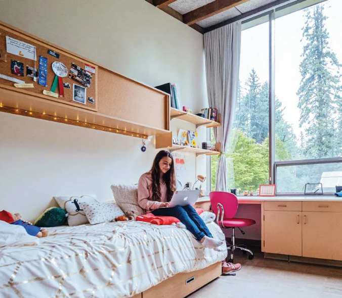 每个学生宿舍有一个洗手池,两个带储物抽屉的桌子,两个壁橱,充足的储物架,电话,无线上网,和两张床(XL床垫可用)。宿舍的公共空间包括带壁炉和舒适座椅的休息室、自习室、厨房和洗衣设施。