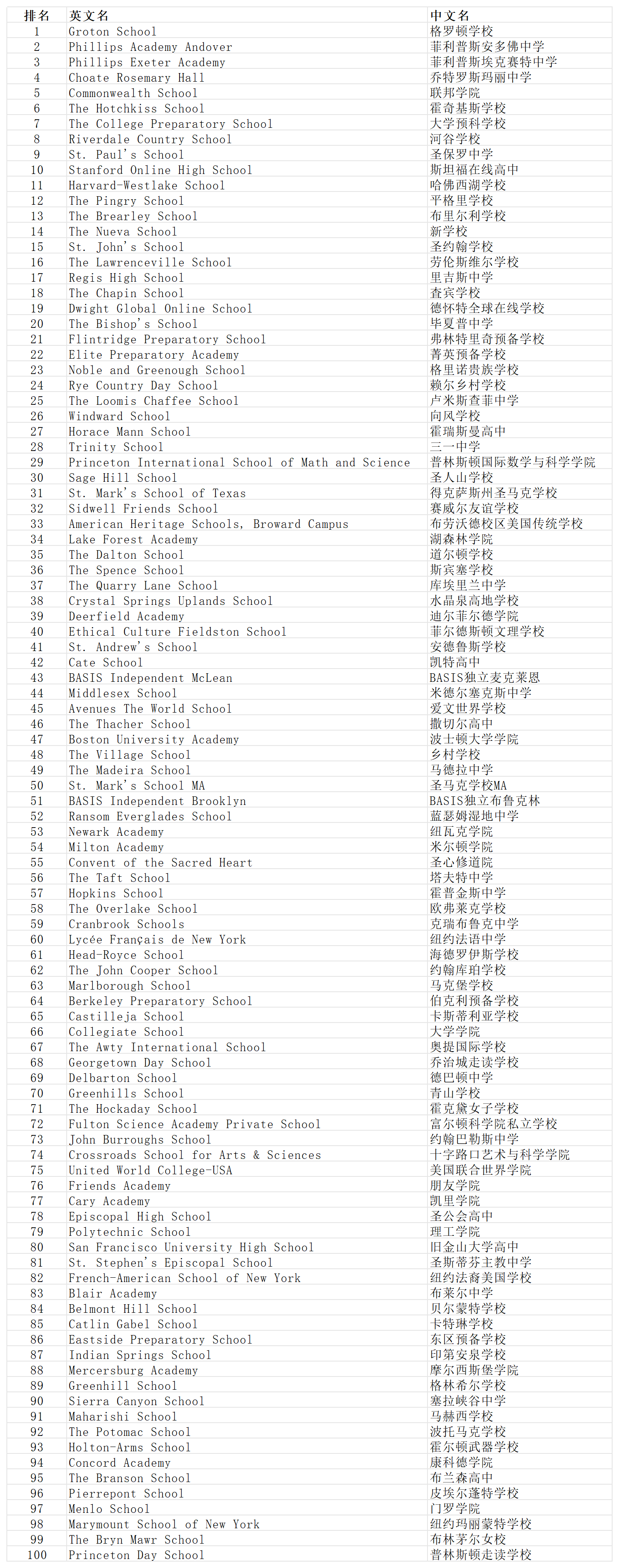在最新的排名中,格罗顿学校(Groton School)大放异彩,一举从第5名跃升至榜首,展现了其卓越的教育实力。与此同时,菲利普斯学校安多佛(Phillips Academy Andover)也实现了排名上升,从第4名攀升至第2名。然而,菲利普斯埃克塞特中学(Phillips Exeter Academy)则遭遇了滑铁卢,从冠军宝座跌落至第3名。