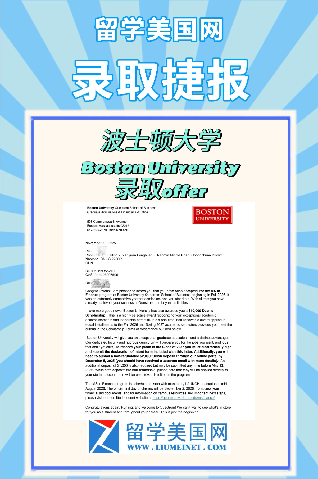 迈润肯最新录取捷报~恭喜S同学斩获BU的录取offer