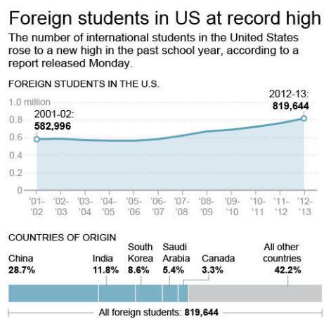 根据美国国际教育研究所(IIE)11日发布的最新统计数据,2012到2013学年共有26.55万来自中国大陆、台湾、香港的学生正在美国的大学留学,继续高居国际学生榜首,其中来自中国大陆的留学生数量继续暴涨,又比上学年增加21.4%,总数达到23.56万人。