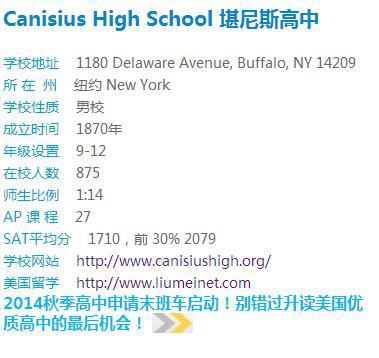 Canisius High School 堪尼斯高中是一所位于东部纽约州的私立走读男校,学校高级教师比高达98%,目前国际生一共只有5人,历史悠久,建于1870年。另外,学校设施先进,AP数量高达24门,TOP30%SAT平均分高达2000多分!下面是学校超棒的大学升学!