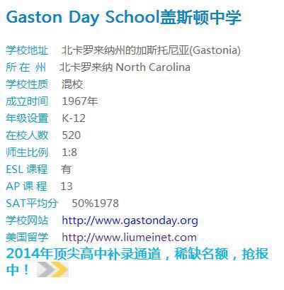 盖斯顿中学是一所提供全日制K-12年级的美国私立高中,学校占地60英亩,共有学生520名,在校教职员工65名。该校是一所著名的大学预备制学校,建校以来,培养了一大批著名的学者,领导者,艺术家及音乐家。