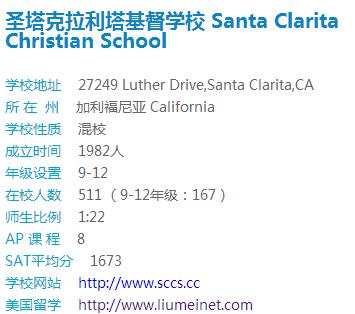 圣塔克拉利塔基督学校 Santa Clarita Christian School位于洛杉矶北部30英里处的Santa Clarita, 风景怡人。学校致力于培养21世纪的年轻人发展成为对社会和世纪具有非同寻常影响力的人。学校不仅要求学生成为一名严谨的学者,更训练他们熟练应用知识,以有形具体的方式影响他人。学校的个人学术支持项目为学生提供个性化服务,致力于学生学术,心理,素养等全方位的培养。