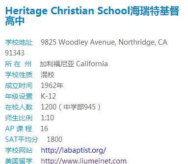 海瑞特基督高中Heritage Christian School(原名“洛杉矶浸会中学”)由洛杉矶浸会城市传教会在1962年建立。本校教师90%持有硕士以上学位;该校学术竞争力很强,提供14门AP课程,毕业生去向非常好,近两年的毕业生已包揽了所有常青藤、MIT、CIT、斯坦福大学以及美国最强大的UC教育系统中所有学校的录取。
