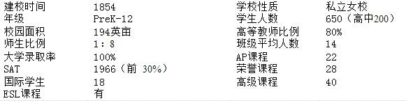100%的毕业生顺利升入大学:普林斯顿大学、哈佛大学、耶鲁大学、哥伦比亚大学、麻省理工学院、宾夕法尼亚大学、布朗大学、康奈尔大学、莱斯大学、圣母大学 。