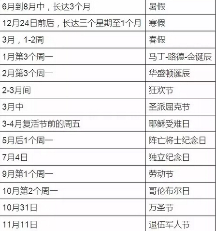 接下来就是寒假,其中包括圣诞节、新年等美国国定假期,假期长达三个星期至一个月。