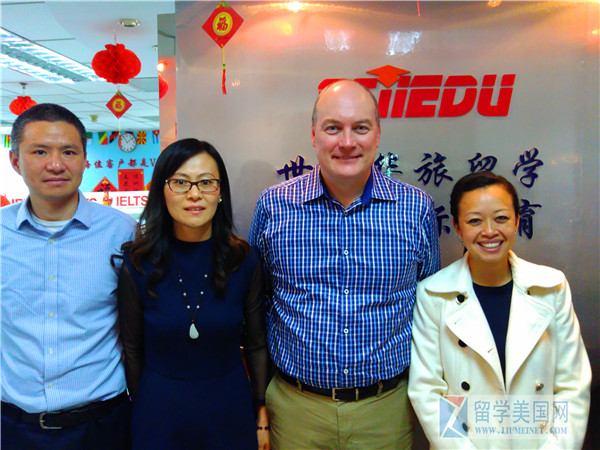 图为留学美国网总监石老师与莫若校长Mr. Terry Lee(右二)与招生官(右一)一行