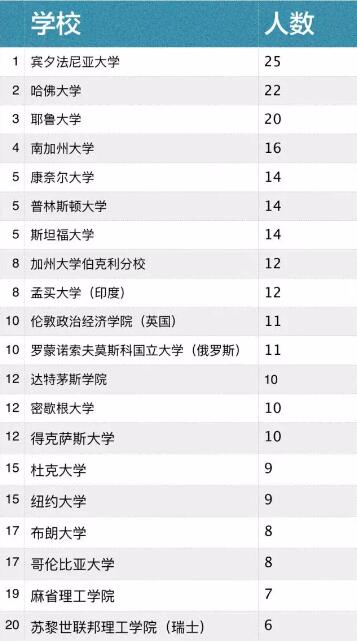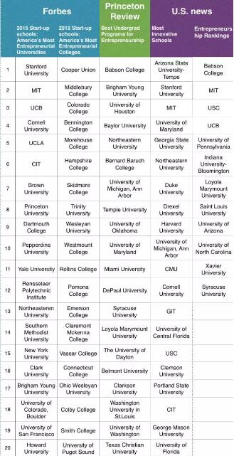 先让我们看一下各家评出的最适合创业的大学TOP20榜单:
