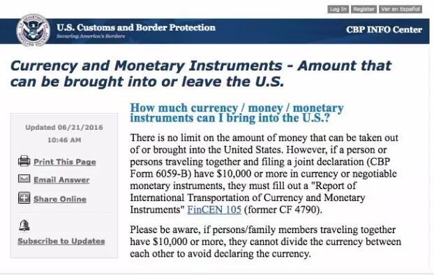 · 超额没收:如果携带金额超过$10,000 没有申报,可能面临全额没收、甚至收到法律处罚。