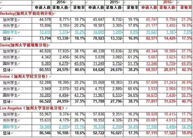 加州大学各校区2016年申请人数、录取人数及录取率数据公布。从国际生的录取率来看,加州大学伯克利申请难度不亚于有些藤校,今年仅为7.6%。