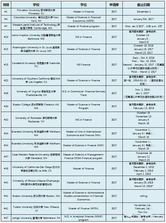 2017年美国研究生Top50院校截止日期!