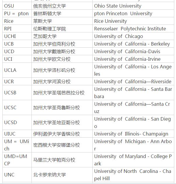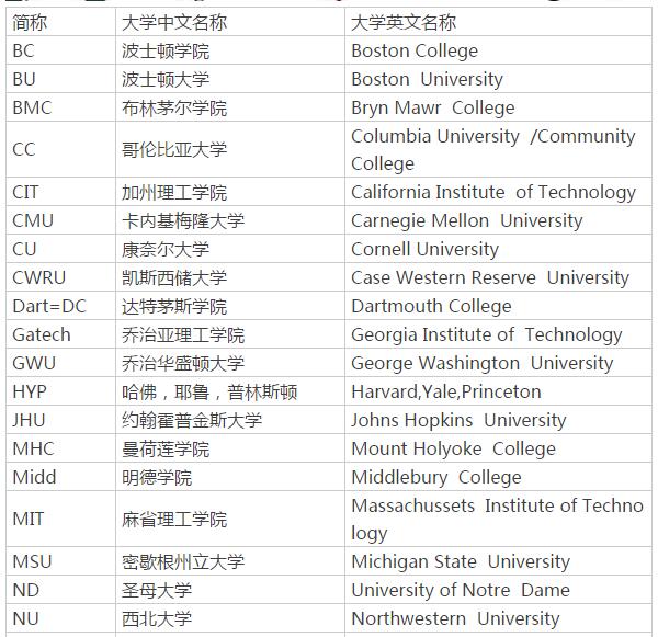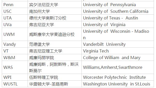 按字母顺序排列的简称对照(前面的数字为本科综合排名仅供参考)
