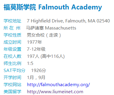 FalmouthAcademy福莫斯学院建于1977年。自建校以来,学校从最初仅有43名学生发展到今天为全国所熟知的,专注于大学预备的中学,现有学生近200名,已成为科德角地区规模最大绿地面积最多的教育组织。进入21世纪,学校紧跟时代需求发展新兴科技和领导力的教育。同时,自学校成立之初便加入学校的部分教师至今仍致力于本校的教育事业。