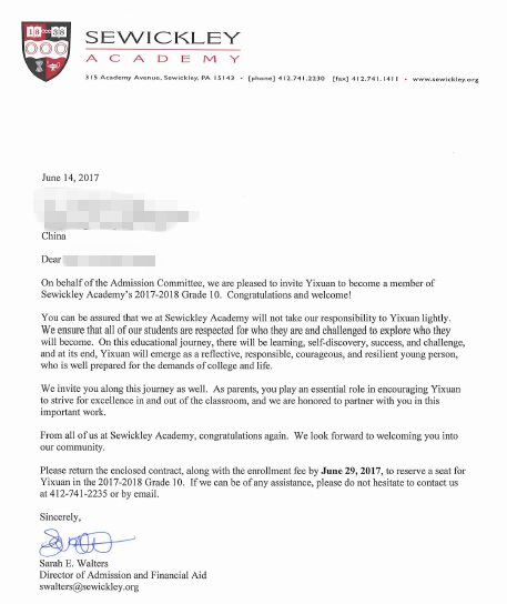 蔡同学录取offer二:Sewickley Academy