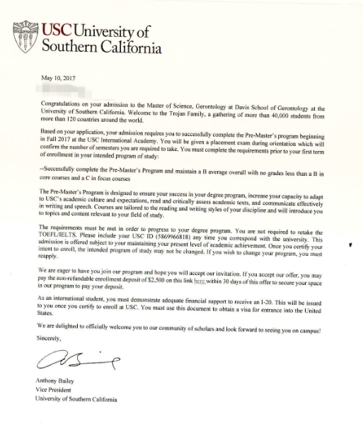 好消息:恭喜WYN同学获得USC university of Southern California录取offer,这个offer来之不易,凝聚了留美网全体员工的心血,最终顺利拿到了南加大的硕士预科录取,在这里祝W同学前程似锦,展翅高飞!