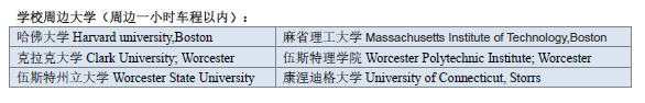 玛丽安娜波利斯预备学校距离哈佛大学、伍斯特州立大学、麻省理工大学、伍斯特理学院、康涅迪格大学和克拉克大学的车程均在1小时之内。