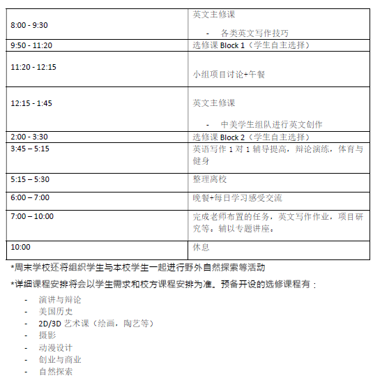 夏令营会为每一位中国学生配对一位美国本土学生作为搭档一起进行写作,也将在选修课和活动中与美国的优秀学生进行团队合作和竞争。在激发学生学习的潜力和动力的同时,与优秀美国学生建立国际友谊,在通往藤校的道路上共奋进。