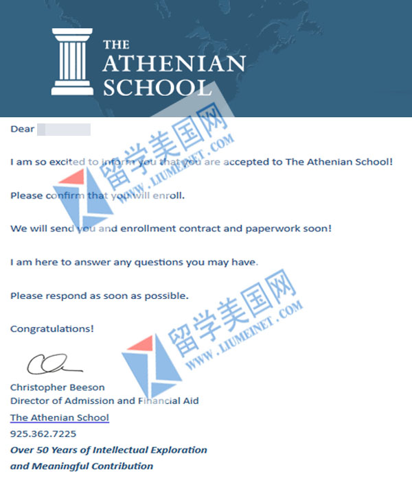 恭喜L同学成功补录到顶尖寄宿 The Athenian School(寄宿排名36),感兴趣的同学可以马上咨询:400-000-7805,010-65183908,微信:liumeinet