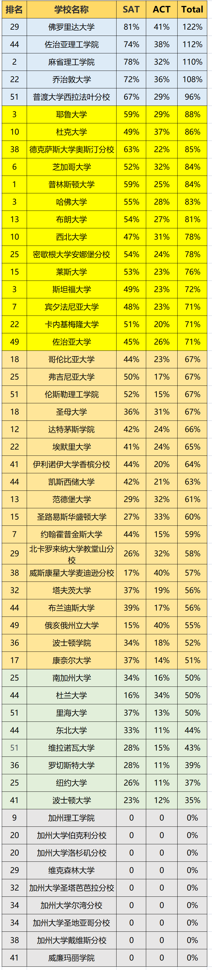 我们这里为大家分享一个表格,这张表格里粗略计算了各个学校的SAT/ACT提交率之和。