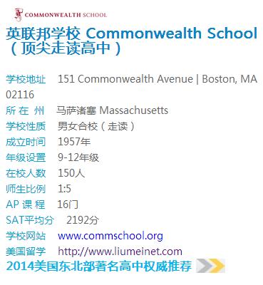 英联邦学校Commonwealth School是一所男女混合制的走读学校,拥有155名来自世界不同国家的学子们聚集。学校坐落于马塞诸塞州的首府波士顿的第151英联邦大道上,环境优美,气候宜人,让不少渴望求学的孩子们真正的感受到美国高中文化的底蕴。
