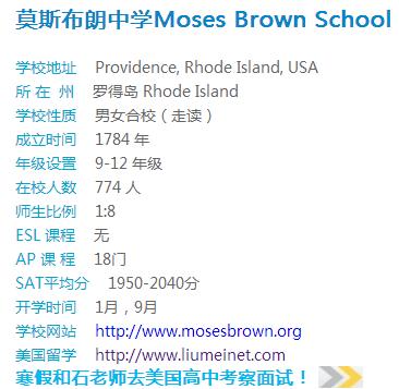 学校是一所成立于1784 年的教友学校, 共有学生400 人。学校的创始人莫斯布朗是一位具有创新思维的思想家、慈善家和企业家,Brown 家族也是当时新英格兰地区最大的贸易商。莫斯布朗在晚年投身于贵阁会并创建此校,是美国最古老的几所高中之一。