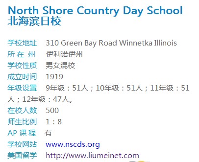 北海滨日校是一所走读制大学预备,艺术,科技,服务,远程教育学校,年级从PK-12,成立于1919年。位于郊区的校园临近芝加哥,占地16英亩,有6所建筑。学校是由NAIS,伊利诺斯州教育部批准的私立学校。学校总捐赠基金高达$:1700万,总注册人数500人。高中部平均每班14人,师资比例1:8。高中学生需每周上课5天。