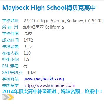 梅贝克高中Maybeck High School是一个充满活力的学习型社区,在相互支持、尊重和富有责任心的环境中,任何形式的多样性文化都可以蓬勃发展。学校小班教学,对学生寄予厚望,希望学生追求学术卓越,发展校外项目,在此基础上,让学生为上大学做好准备,并获取必要的技能,以积极和富有创造力的姿态投身到更广阔的世界中。